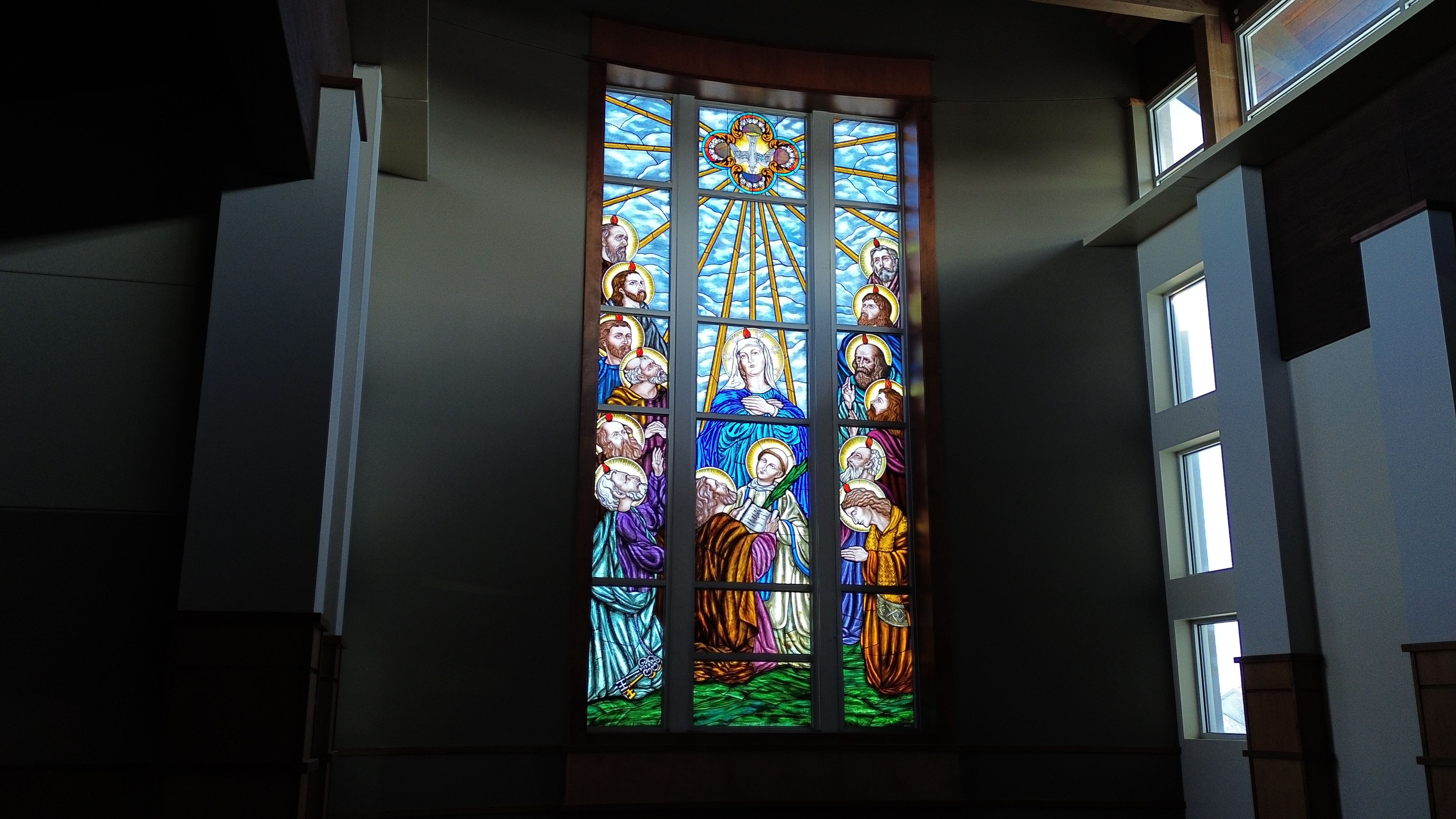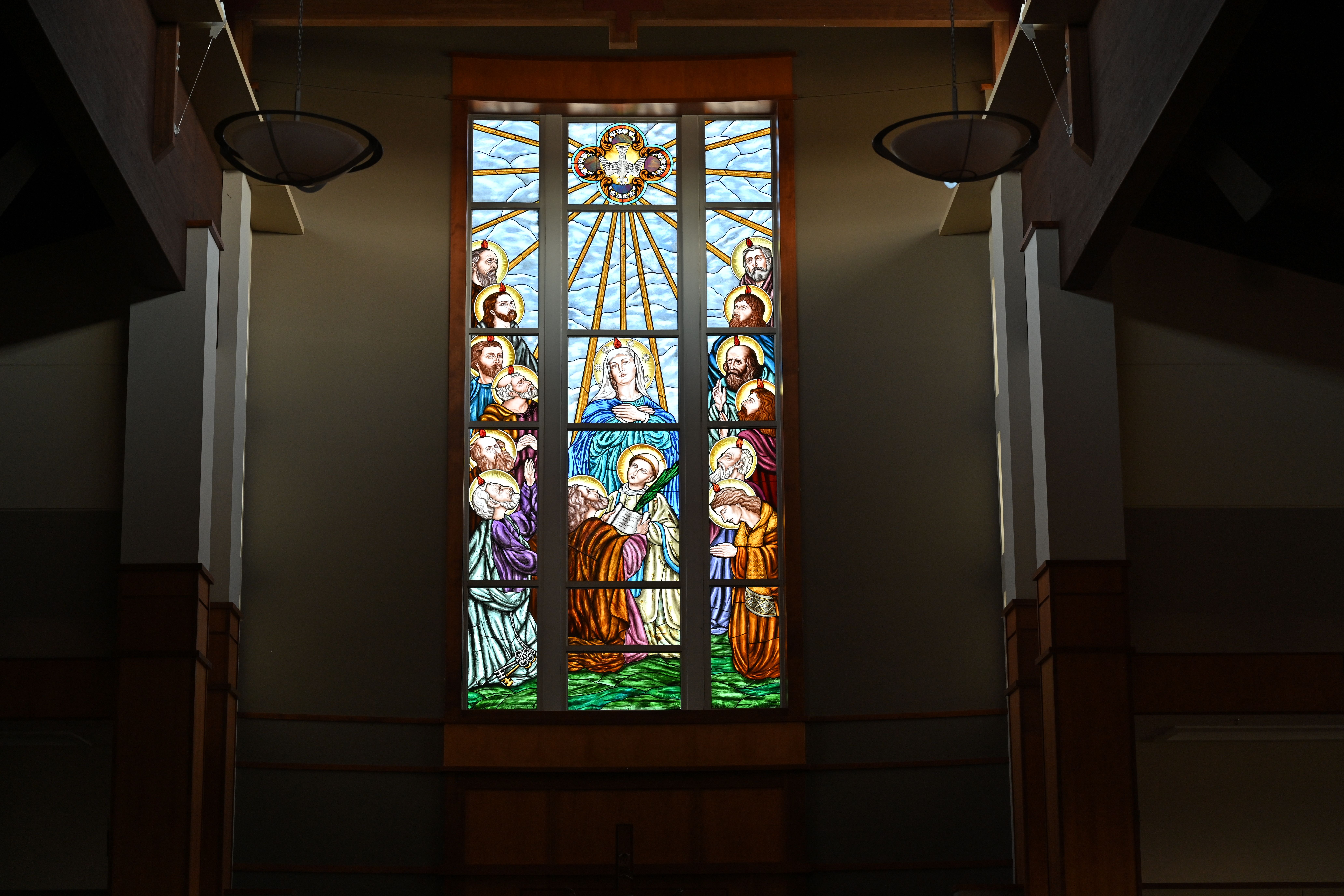 This Pentecost window for St. Stephen Catholic Church in Oak Creek was shaped through a careful and thoughtful design process, attentive both to theological clarity and artistic restraint. Fr. Stephen’s direction emphasized a unified visual language, drawing from the quieter Renaissance palette found in Spanish masters such as Juan de Juanes and Maino. The composition seeks to balance clarity and movement, allowing the scene to unfold with a sense of ordered dynamism appropriate to Pentecost, while maintaining harmony across the whole.